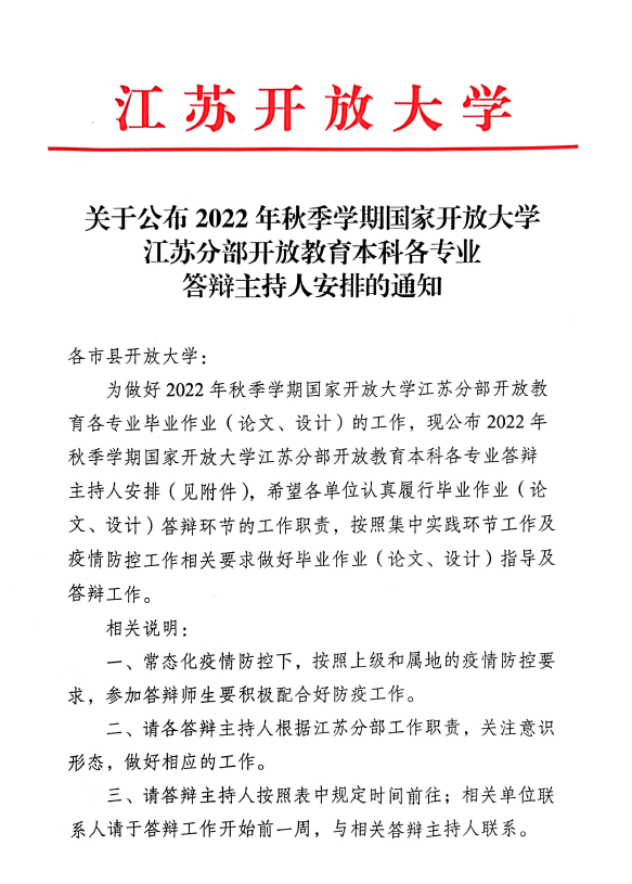 關于公布2022年秋季學期國家開放大學江蘇分部開放教育本科各專業答辯主持人安排的通知