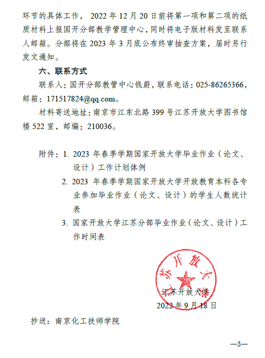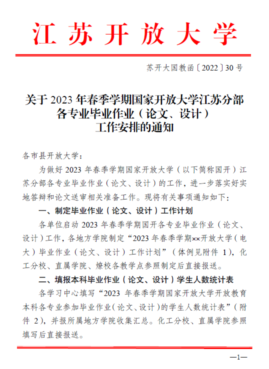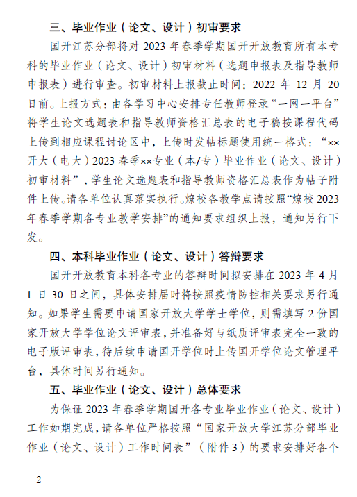 關于2023年春季學期國家開放大學江蘇分部各專業畢業作業(論文、設計)工作安排的通知