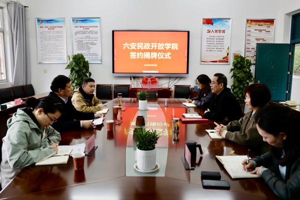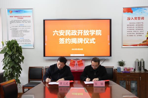 3月20日,六安民政開放學院簽約揭牌儀式在六安開放大學舉行。六安市民政局黨組成員、副局長曹文武,六安開放大學黨組書記、校長張敏,黨組成員、副校長馮春源及各處室負責人出席儀式。