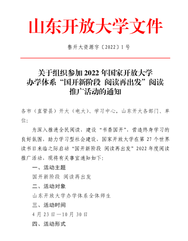 關于參加2022年國家開放大學辦學體系+“國開新階段+閱讀再出發”閱讀推廣活動的通知