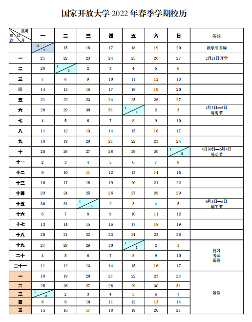 國家開放大學2022春校歷