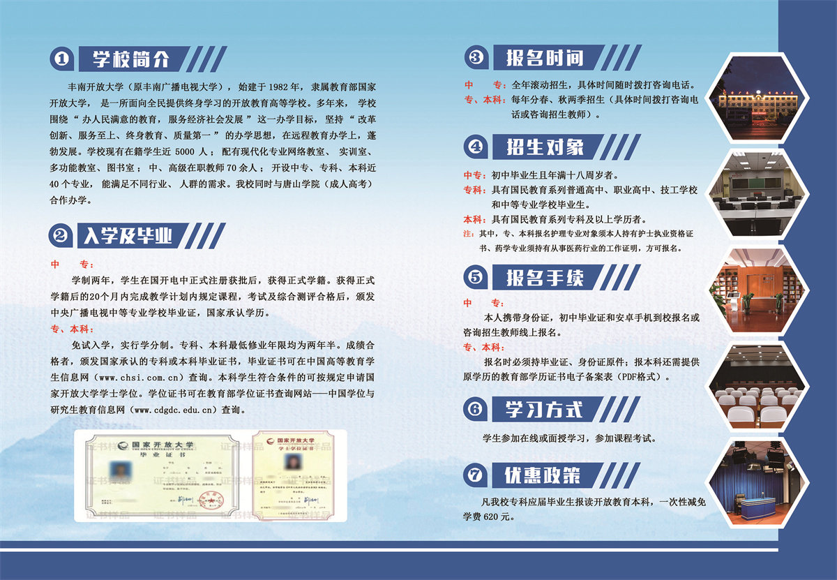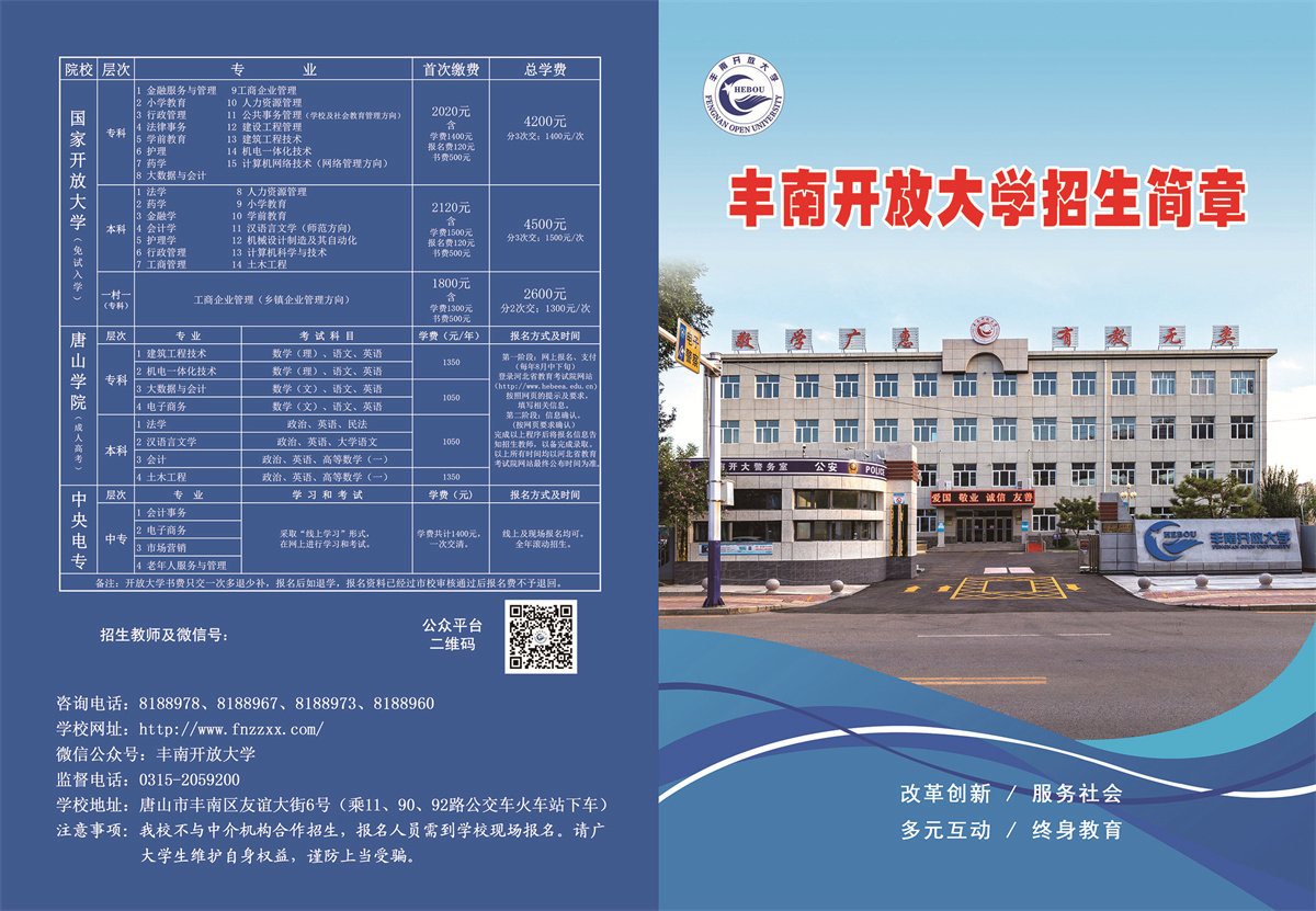 豐南開放大學(原豐南廣播電視大學),始建于1982年,隸屬教育部國家開放大學,是一所面向全民提供終身學習的開放教育高等學校。多年來,學校圍繞“辦人民滿意的教育,服務經濟社會發展”這一辦學目標”,堅持“改革創新、服務至上、終身教育、質量第一”的辦學思想,在遠程教育辦學上,蓬勃發展。學校現有在即學生近5000人;配有現代化專業網絡教室、實訓室、多功能教室、圖書室;中、高級在職教師70余人;開設中專、專科、本科、近40個專業,能滿足不同行業、人群的需求。我校同時與唐山學院(成人高考)合作辦學。