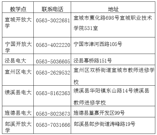 國家開放大學安徽分部宣城開放大學各教學點聯系方式