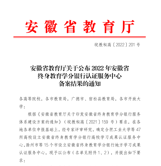 近日,安徽省教育廳印發了《關于公布2022年安徽省終身教育學分銀行認證服務中心備案結果的通知》(皖教秘〔2022〕201號),滁州開放大學獲批成為安徽省終身教育學分銀行滁州市學習成果認證服務中心,這也是安徽省首批、滁州市唯一的地方學習成果認證服務中心。