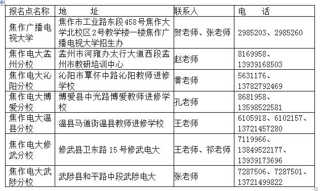 三、焦作市電大及各縣級電大報名地址及聯系電話: