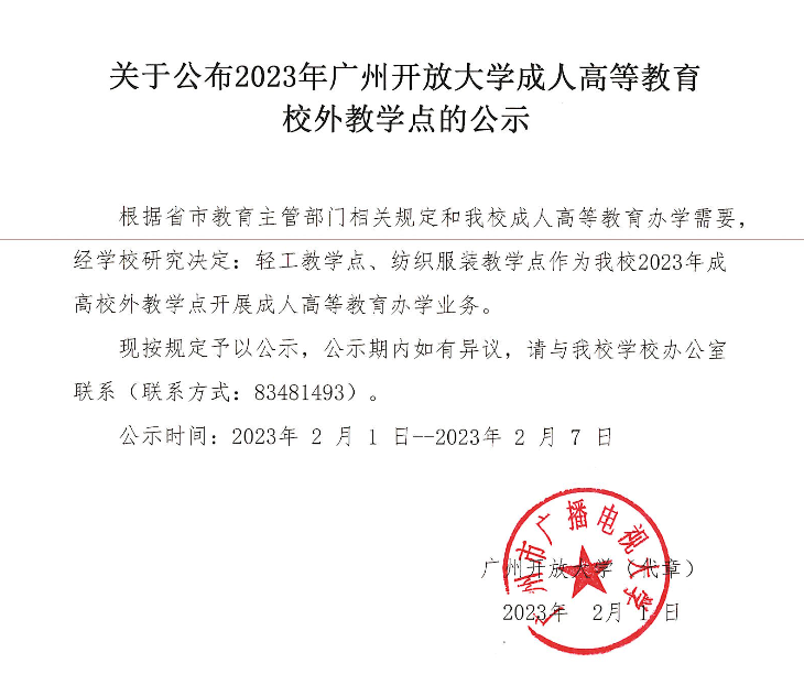 關于公布2023年廣州開放大學成人高等教育校外教學點的公示