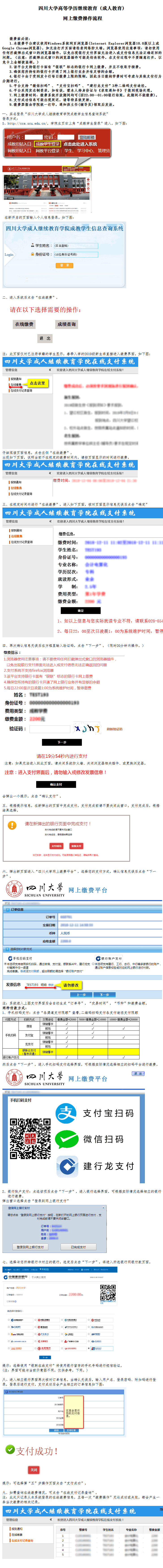 四川大學繼續教育是學校開展人才培養、社會服務的重要橋梁,是推動構建全民終身教育體系和服務學習型社會的重要渠道,是助力建設高素質干部隊伍和專業技術人才的重要平臺。四川大學繼續教育學院是學校學歷繼續教育和非學歷教育辦學實體單位,主要在四川大學望江校區和華西校區辦學,校園環境優雅、花木繁茂、景色宜人,人文底蘊深厚,是繼續深造的理想園地。那么四川大學成人高考報名費用怎么繳?下面小編將為你解答,具體如下: