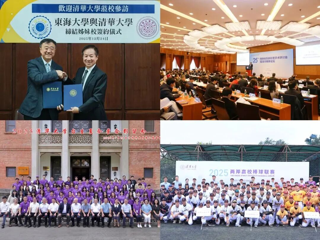 12月24日,楊斌老師率團赴臺與東海大學簽署協議;2025兩岸關系新形勢學術研討會暨清華兩岸論壇;2025清華大學臺生夏令營開幕式合影;2025兩岸棒球聯賽合影