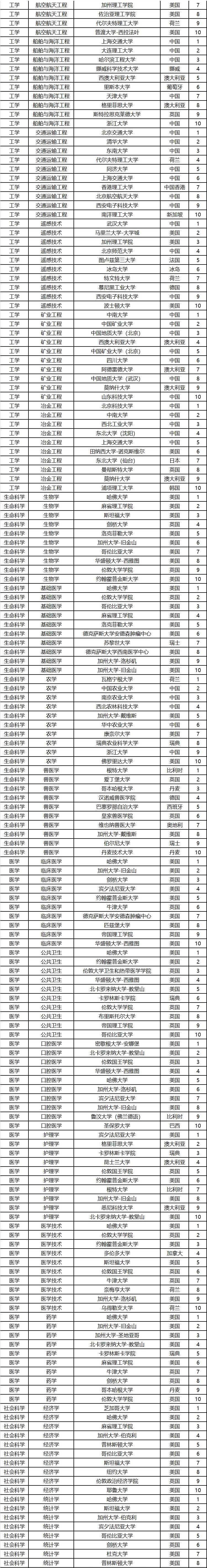 中國內地高校在工學領域表現強勢,在18個工學學科的世界五十強中,中國內地高校的數量超過10所,分別是儀器科學(25所)、化學工程(21所)、交通運輸工程(21所)、礦業工程(21所)、納米科學與技術(20所)、通信工程(19所)、能源科學與工程(17所)、材料科學與工程(16所),船舶與海洋工程(16所)、生物醫學工程(14所)、遙感技術(14所)、機械工程(13所)、冶金工程(13所)、計算機科學與工程(12所)、控制科學與工程(11所)、食品科學與工程(11所)、土木工程(10所)和航空航天工程(10所)。