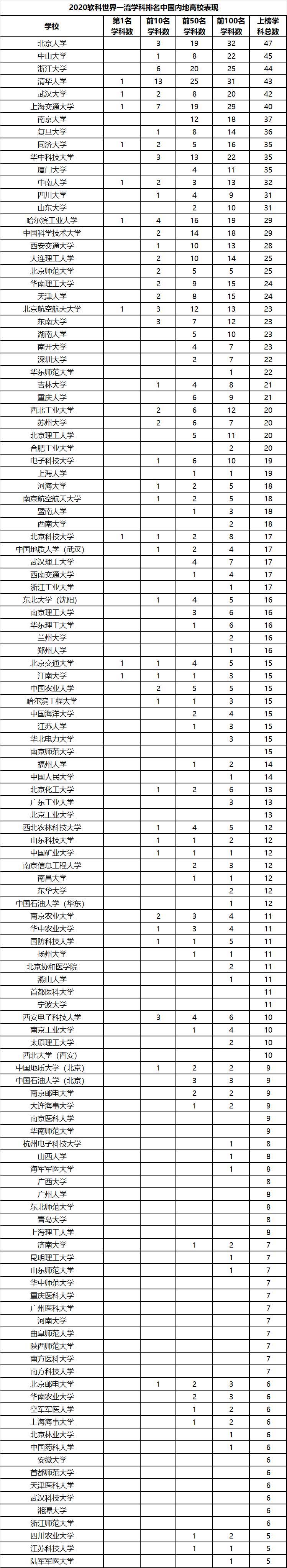 2020軟科世界一流學科排名中,中國內地高校表現強勁,在10個學科奪得世界第一,分別是清華大學(通信工程)、哈爾濱工業大學(儀器科學)、同濟大學(土木工程)、上海交通大學(船舶與海洋工程)、武漢大學(遙感技術)、北京科技大學(冶金工程)、北京航空航天大學(航空航天工程)、北京交通大學(交通運輸工程)、江南大學(食品科學與工程)和中南大學(礦業工程)。