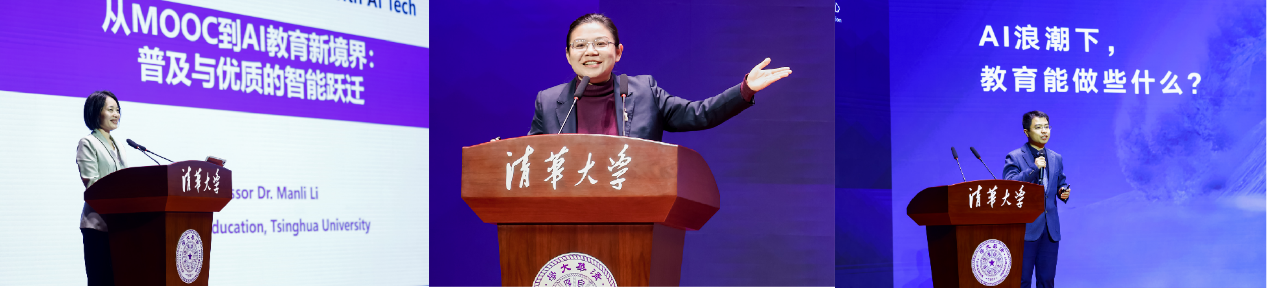 本次會議以智慧教學為主題,在生成式人工智能高速發展的背景下展開研討。教育部在線教育研究中心秘書長、清華大學在線教育中心主任汪瀟瀟與清華大學學堂在線負責人王帥國共同作“AI賦能教育教學探索之路”的系列主題報告。教育部在線教育研究中心副主任、清華大學教育研究院教授李曼麗作“從MOOC到AI教育新境界:普及與優質的智能躍遷”主題報告。