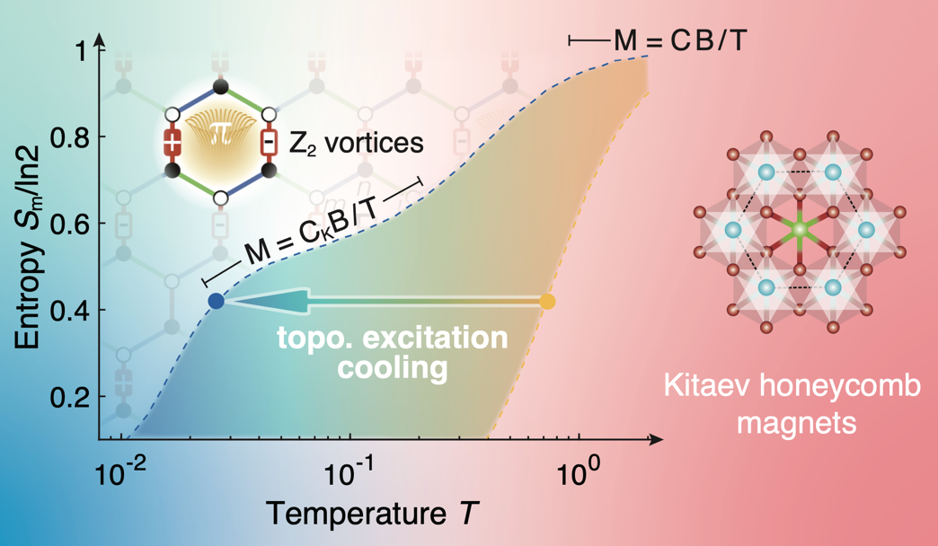 阻挫量子磁體通常具備較高的磁性離子密度、強烈的自旋漲落以及磁激發帶來的增強熱導等,并且材料結構穩定,可作為新型的磁制冷工質,有望實現極低溫的固態制冷。吉塔耶夫量子自旋液體由于阻挫效應與量子漲落的共同作用,即便在遠低于相互作用能標的低溫甚至零溫時也不會形成磁有序,其低能拓撲激發會攜帶巨大的低溫熵,通過外場的有效調控能夠實現顯著的磁卡效應,進而實現拓撲激發極低溫制冷,這為探索新型固態制冷機制開辟了一條新途徑。