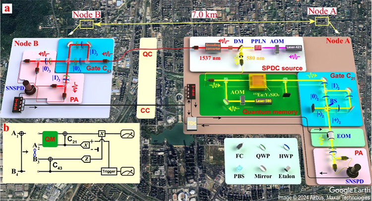在該工作中,研究團隊基于量子門隱形傳送協議來建立兩個量子節點之間的非局域量子門。兩個量子節點之間的直線距離為7公里,分別位于中國科學技術大學東校區(簡稱中國科大)和合肥市大蜀山東側(簡稱大蜀山)。研究團隊首先在兩節點間使用通信波段光子和專線光纜進行了量子糾纏態的遠程分發。隨后,中國科大節點和大蜀山節點分別執行本地的兩比特量子門操作。中國科大節點采用摻銪硅酸釔晶體實現糾纏光子的存儲,直到接收到大蜀山節點的測量結果,并根據這一結果執行相應的單比特門操作。