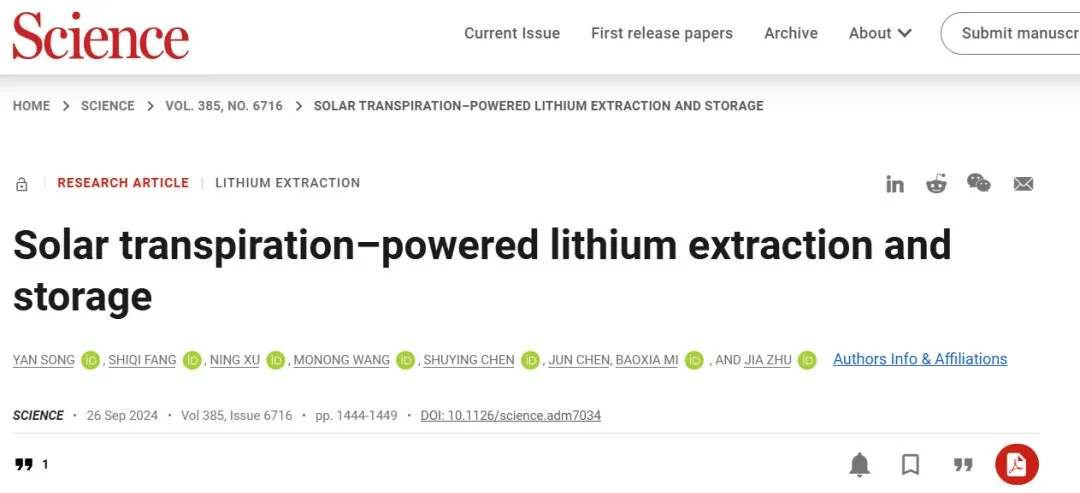 南京大學朱嘉教授、陳駿院士與合作者在鹽湖鋰資源綠色開發領域取得重要突破。該工作通過仿生鹽土植物的“選擇性吸收-儲存-釋放”機制,成功開發界面光熱鹽湖提鋰技術。該技術利用界面光熱蒸騰效應,強化納米通道傳質并驅動高精度離子分離,實現了高選擇性、低能耗、低碳排放的太陽能鹽湖提鋰。這一技術有望推動我國青藏鹽湖鋰資源的綠色開發,減少對進口鋰礦的依賴,保障戰略性關鍵金屬鋰的安全供給。相關研究成果以“Solar transpiration-powered lithium extraction and storage”為題,于2024年9月27日發表于Science期刊。