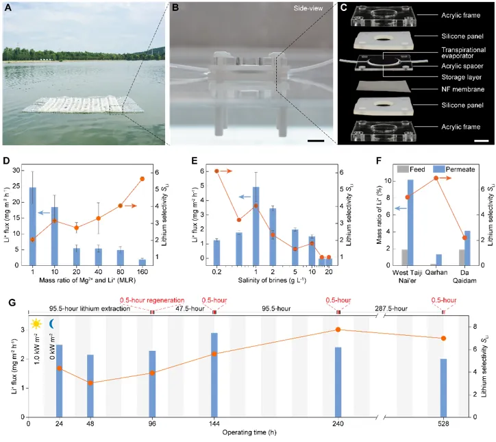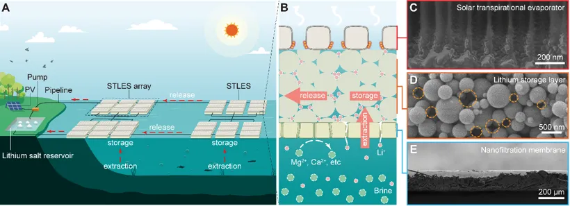 受此啟發,南京大學研究團隊成功開發了界面光熱鹽湖提鋰裝置(STLES)。其結構和工作原理如圖1所示,主要包括三部分:(1)界面光熱蒸騰作用在蒸發器納米通道(圖1C)內產生超高毛細壓強;(2)該毛細壓強傳遞至離子分離層(圖1E),驅動鋰離子選擇性從鹽水進入儲存層;(3)通過水循環系統收集儲存層(圖1D)中富集的鋰鹽,并實現裝置再生。