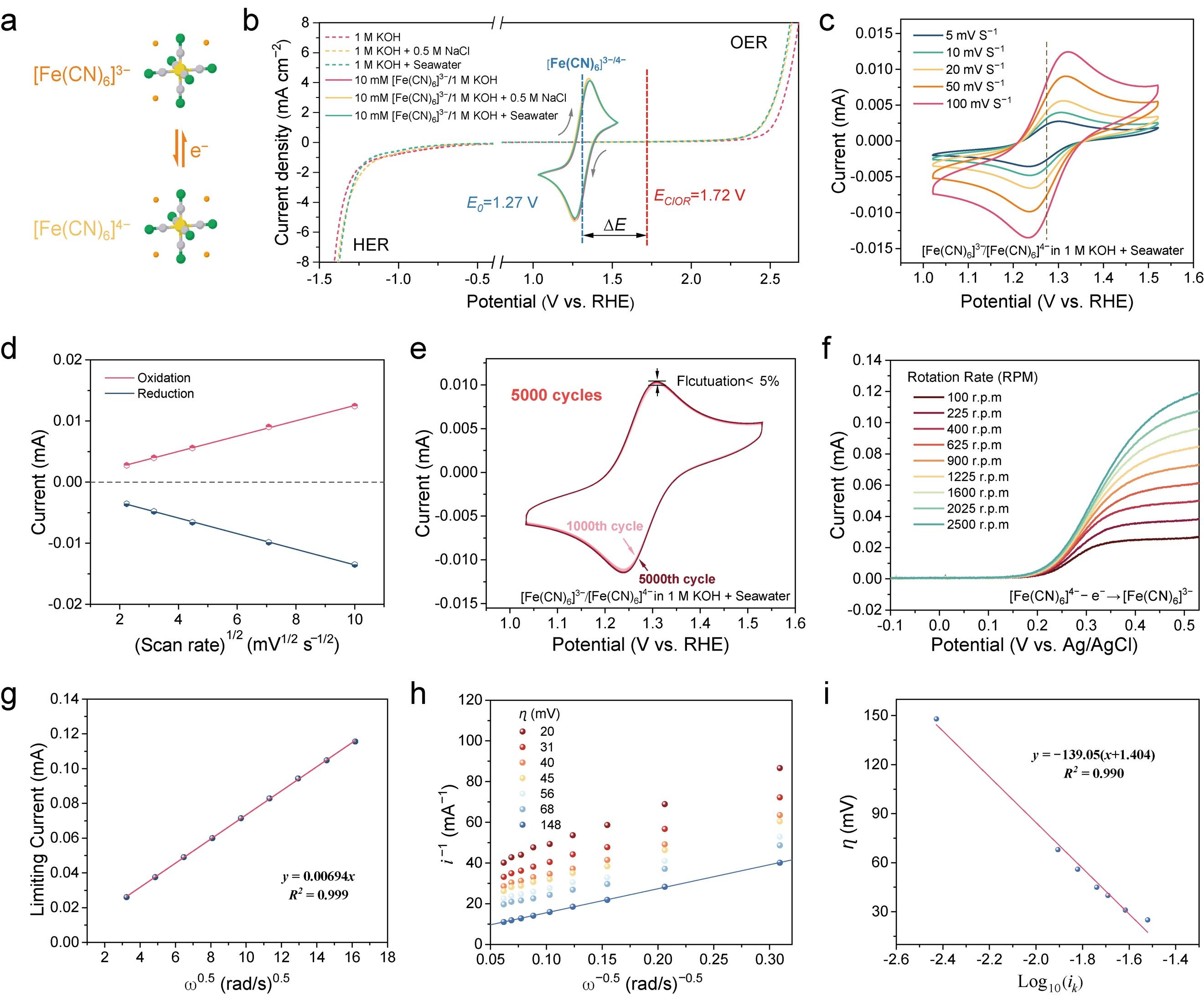 該研究針對海水制氫中最棘手的氯離子干擾難題,引入氧化還原介導的解耦策略,利用兼具熱力學和動力學優勢的陽極反應,巧妙規避了傳統電解水制氫過程中析氧反應與氯離子反應的直接競爭,大幅降低了電化學腐蝕。在該研究中,[Fe(CN)6]3?/4?電對在在海水中不僅保持了優異的可逆氧化還原動力學特性,而且在200 mA cm?2的接近工業級電流密度下實現了超過250小時的長時間穩定運行。