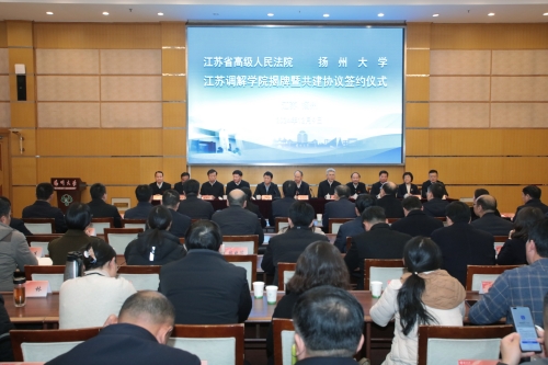 12月9日下午,揚州大學舉行江蘇調解學院揭牌暨共建協議簽約儀式。活動現場,江蘇省高級人民法院黨組書記、院長夏道虎,揚州大學黨委書記焦新安共同為“江蘇調解學院”揭牌。江蘇省高院與揚州大學共同簽訂《共建江蘇調解學院合作框架協議》,揚州中院與揚州大學共同簽訂《全面合作協議》。