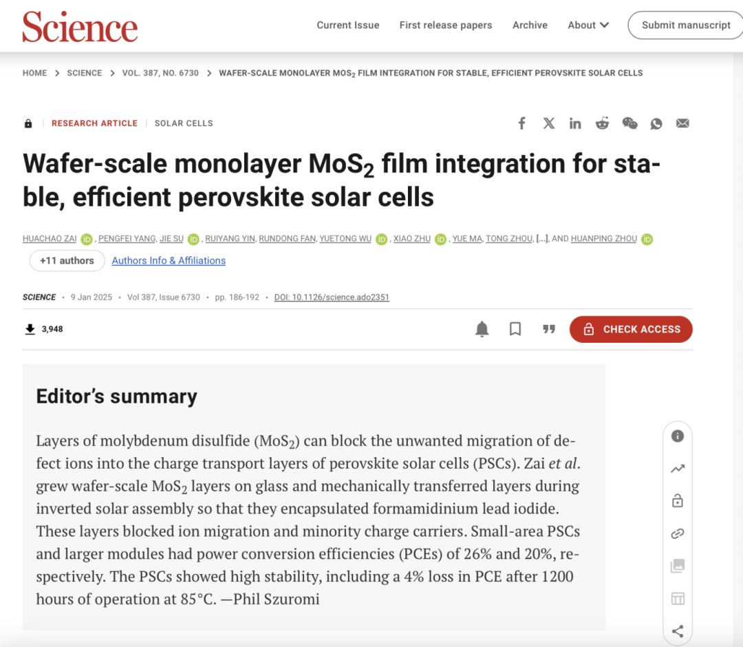 1月9日,北京大學周歡萍教授、張艷鋒教授(共同通訊作者)在Science上發表了題為“Wafer-scale monolayer MoS2 film integration for stable, efficient perovskite solar cells”(晶圓級單層MoS2薄膜集成實現穩定、高效的鈣鈦礦太陽能電池)的研究論文。