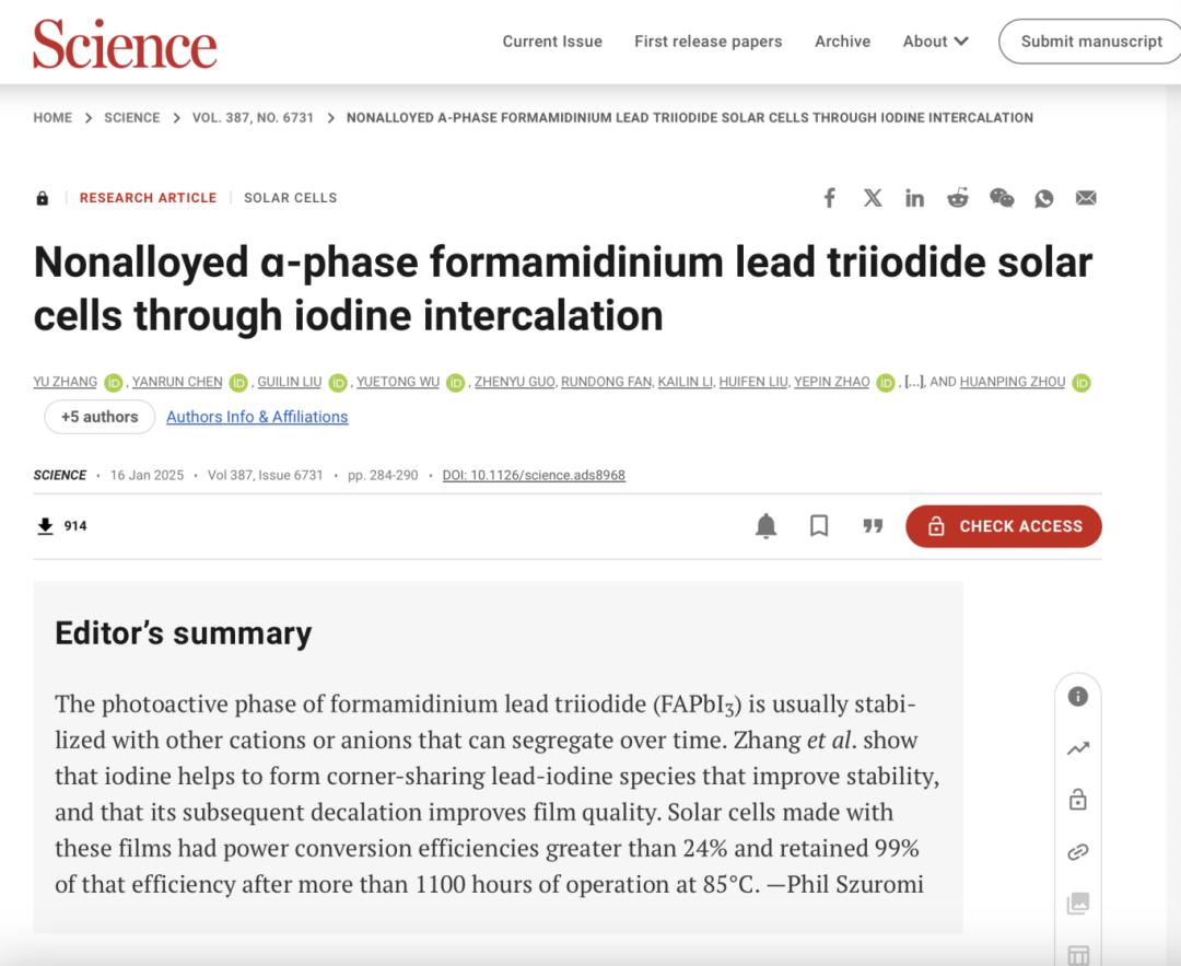 1月16日,周歡萍教授為獨立通訊作者,再度在Science發表了題為“Nonalloyed α-phase formamidinium lead triiodide solar cells through iodine intercalation”(通過碘嵌入制備非合金α-FAPbI3太陽能電池)的研究論文。這是Science期刊在一周之內連續兩次刊發周歡萍團隊在鈣鈦礦太陽能電池領域的研究進展。