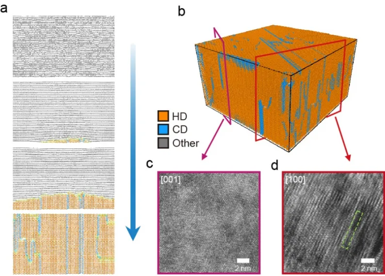 圖2. 石墨經由后石墨相向六方金剛石結構轉變的動力學模擬及其與實驗電鏡對比照片