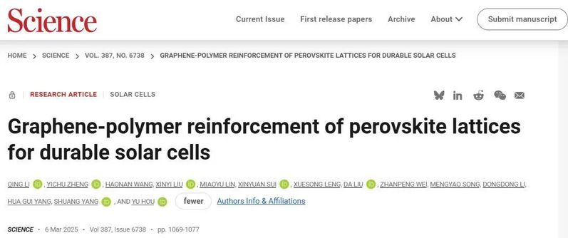 北京時間3月7日凌晨,華東理工大學材料學院清潔能源材料與器件團隊侯宇教授、楊雙教授等人在Science(《科學》)發表題為“Graphene-polymer reinforcement of perovskite lattices for durable solar cells”的最新研究成果。該研究發現了鈣鈦礦光伏不穩定性的關鍵機制——光機械誘導分解效應,提出石墨烯-聚合物機械增強鈣鈦礦材料的新方法,制備的太陽能電池器件在標準太陽光照及高溫下的T97工作壽命創下3670小時新紀錄,該研究成果將為鈣鈦礦太陽電池的產業化應用提供全新解決方案。