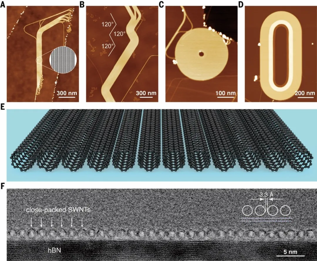 碳納米管陣列晶體是通過一種納米顆粒催化的化學氣相沉積(CVD)生長技術實現的。實驗觀測發現,生長得到的碳納米管陣列均由同一手性的碳納米管組成,碳納米管之間相互平行、緊密排列,間距為固定的0.33 nm。理論分析揭示,這種近乎完美的陣列結構的形成源自于碳納米管與六方氮化硼基底之間的超潤滑摩擦特性及碳納米管間的范德華相互作用:生長出的碳納米管可以在基底上自由滑動,找到能量更低的構型,反復折疊排列在一起,并最終自組裝形成范德華晶體結構。