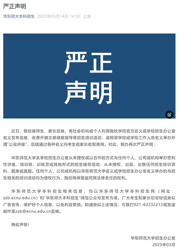 3月14日,華東師范大學招生辦公室發布《嚴正聲明》稱,華東師范大學及學校招生辦公室從未授權或以合作的方式與任何個人、公司或機構舉辦營利性講座、培訓班、訓練營或其他形式的招生輔導活動;從未授權、出版、出售任何招生培訓資料、題庫或真題。
