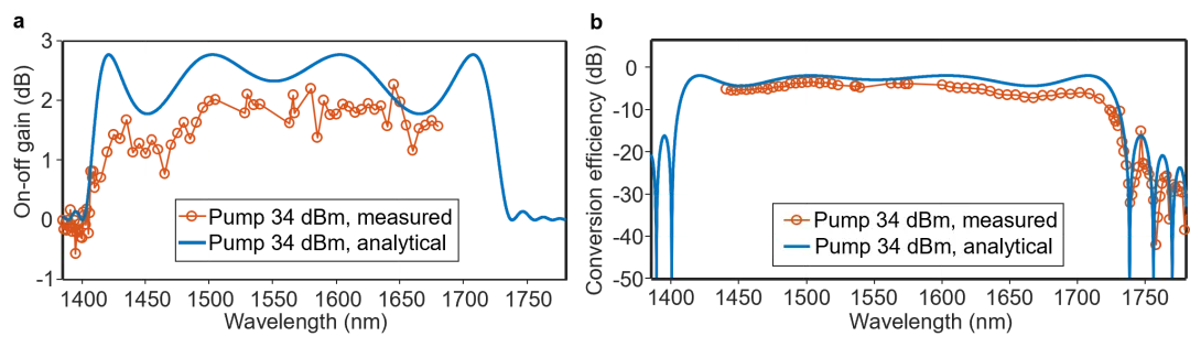 基于以上重大挑戰,趙平團隊提出基于“脊形減模+彎曲濾模”技術的單模、負色散非線性集成光波導設計普適性方法,原理上消除了過往參量放大非線性多模集成光波導中的隨機模式串擾。團隊以超低損耗非線性氮化硅集成平臺為例,制備出具有平坦傳輸光譜的、單模負色散非線性集成光波導芯片,如圖1所示。團隊還進一步發展了非線性氮化硅集成光波導中模電模式基模(TE00)二階與四階色散精確協同調控技術,實驗中實現了帶寬高達330nm的片上光參量放大,如圖2所示。該項研究為新一代超大帶寬光放大提供了新思路,在提升光纖/無線光通信容量,擴大數據中心光互連規模,提高光學測量精度,拓展光譜檢測分析范圍等方面有良好的應用潛力。