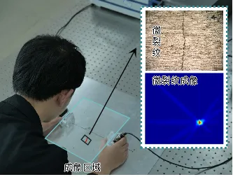 基于非線性超聲的金屬結構近表面微裂紋成像(實驗人員在隔振平臺上進行實驗,檢測對象的近表面含有微米級的微裂紋。如圖所示,操作人員手里拿著兩個傳感器,形成一條檢測路徑,一個作為激勵端,通過振動產生超聲信號,另一個作為接收端,用來接收超聲信號。檢測路徑上如果存在損傷,接收信號的非線性成分會增加,通過對比檢測路徑健康狀況和損傷狀況下接收信號中的非線性成分,就可以知道路徑上是否存在損傷。通過布置多條路徑,路徑間就像蜘蛛網一樣交織在一起,形成多個交點,經過損傷的路徑會高亮顯示,他們的交點就是損傷存在的位置。成像結果展示出非線性超聲可以檢測出金屬板近表面的微裂紋損傷。)