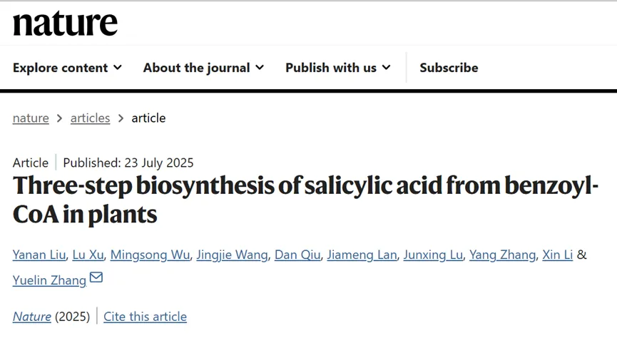 7月23日,四川大學生命科學學院張躍林教授團隊在國際頂尖期刊Nature發表題為“Three-step biosynthesis of salicylic acid from benzoyl-CoA in plants”的突破性研究,首次完整解析植物中一條全新的水楊酸合成通路“PAL/BSH途徑”,并證明該通路在種子植物中廣泛存在且高度保守。四川大學生命科學學院劉亞楠副研究員和英屬哥倫比亞大學徐璐博士為論文共同第一作者,張躍林教授為通訊作者。四川大學張陽教授和英屬哥倫比亞大學李昕教授對該研究提出了重要建議和幫助。該研究得到了國家自然科學基金、四川省自然科學基金等項目資助。論文中涉及的水楊酸及其前體等化合物測試主要在四川大學生命科學學院質譜平臺王晞華博士幫助下完成。