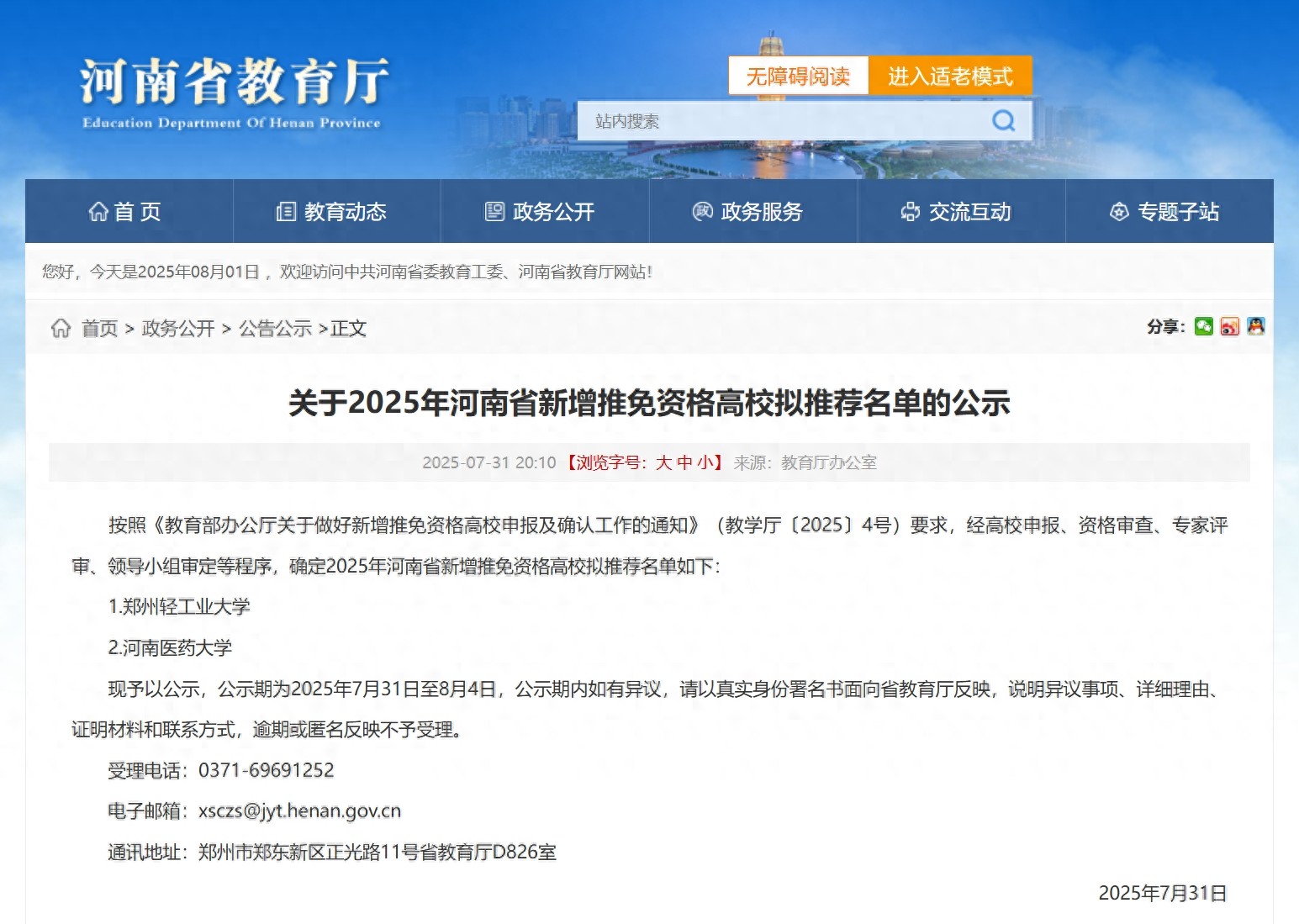 7月31日,河南省教育廳發布《關于2025年河南省新增推免資格高校擬推薦名單的公示》,擬推薦鄭州輕工業大學、河南醫藥大學為新增推免資格高校。公示期為2025年7月31日至8月4日。