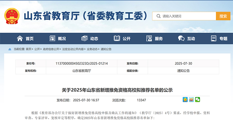 7月30日,山東省教育廳發布《關于2025年山東省新增推免資格高校擬推薦名單的公示》,擬推薦齊魯工業大學、山東第一醫科大學、青島農業大學為新增推免資格高校,公示期為2025年7月30日至8月3日。