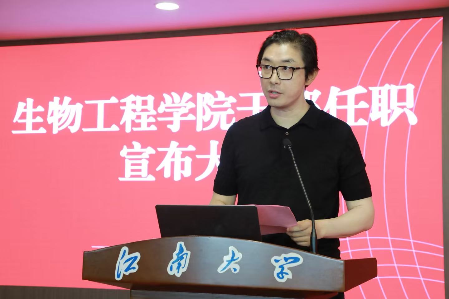 張梁宣讀了學校關于尹健同志擔任生物工程學院院長的任職決定。因工作需要,劉龍同志已任校黨委常委、副校長,經學校黨委研究決定,由尹健同志擔任生物工程學院院長。