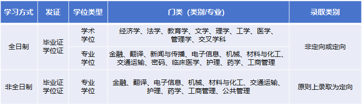 (2)報考類別:非定向就業:入學時須調入個人檔案,畢業前按學校推薦、本人與用人單位雙向選擇的辦法就業;定向就業:錄取前應當與招生單位、用人單位簽訂定向就業合同,不調入個人檔案。