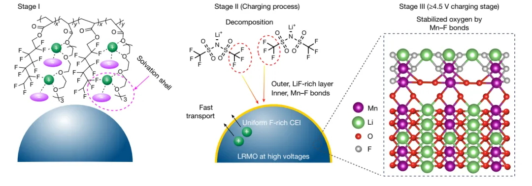 針對以上挑戰,研究團隊提出了“富陰離子溶劑化結構”設計新策略,成功開發出一種新型含氟聚醚電解質。該電解質有效增強了固態界面的物理接觸與離子傳導能力,并顯著提升了界面穩定性。