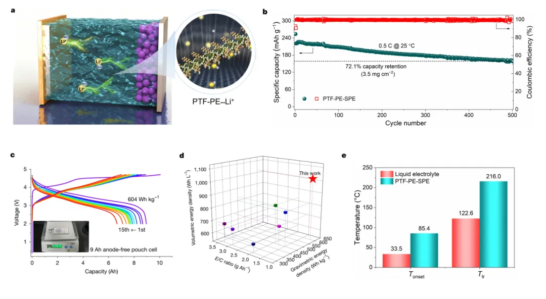 當前,電動汽車、電動飛行器、人形機器人等前沿領域對動力系統提出了高能量、高安全需求,開發兼具高能量密度和優異安全性能的電池器件已成為當前儲能領域的核心挑戰。記者從清華大學獲悉,該校化工系張強教授團隊成功開發出一種新型含氟聚醚電解質,構筑出能量密度達604 Wh kg-1的高安全聚合物電池,解開了鋰電池續航與安全不可兼得的難題。該研究為開發實用化的高安全性、高能量密度固態鋰電池提供了新思路與技術支撐。相關成果日前在線發表于國際期刊《自然》。
