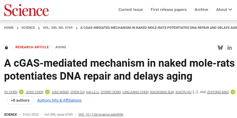 同濟大學生命科學與技術學院、附屬婦產科醫院毛志勇教授團隊的這一科學發現在線發表于國際頂級學術期刊《科學》(Science),論文題目是“A cGAS-mediated mechanism in naked mole-rats potentiates DNA repair and delays aging”(裸鼴鼠中一種由cGAS介導的增強DNA修復及衰老延緩機制)。