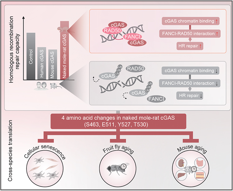 團隊利用前期開發的DNA修復報告系統對關鍵區段及功能位點進行篩選,最終鎖定了裸鼴鼠cGAS的C端結構域中4個進化特異的氨基酸介導了這種功能的逆轉。突變裸鼴鼠cGAS的上述位點導致其功能丟失;而將這4個位點引入人類cGAS,可消除其對同源重組修復的抑制。團隊隨后開展大量實驗,深入揭示了上述4個位點調控同源重組修復的分子機制。