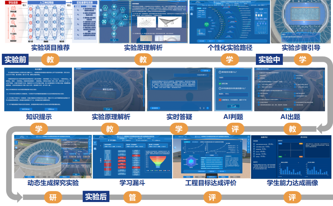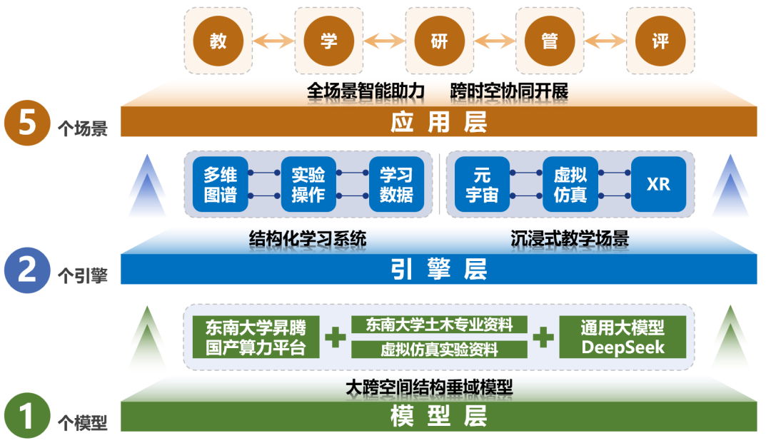 案例依托土木工程一流學科和國家級虛擬仿真實驗教學中心,創新構建了AI、虛仿與XR三大技術深度融合(X3)的土木智慧實驗教學平臺CiviX3-LAB。該平臺聚焦傳統實驗教學中沉浸感不足、個性化缺失、評價單一等難題,通過打造云邊端協同的智能實驗教學基座,實現教學資源云端共享、實驗數據邊緣實時處理和多終端沉浸式交互。采用了“1模型+2引擎+5場景”的分層體系架構,成功延拓了實驗教學的時間和空間、深度和廣度,重塑了“時空開放、動態自主、問題牽引”的未來實驗課堂新范式。