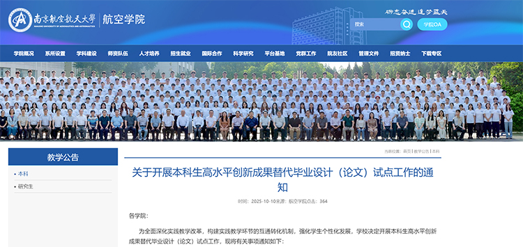 近日,南京航空航天大學發布《關于開展本科生高水平創新成果替代畢業設計(論文)試點工作的通知》,明確2026屆本科畢業生可申請用高水平競賽獲獎、創新實踐項目結題、學術論文發表、發明專利授權四類成果,替代畢業設計(論文)。