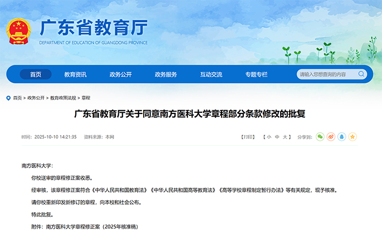 10月10日,廣東省教育廳在官網公布批復結果:“經審核,該章程修正案符合《中華人民共和國教育法》《中華人民共和國高等教育法》《高等學校章程制定暫行辦法》等有關規定,現予核準。請你校重新印發新修訂的章程,向本校和社會公布。”