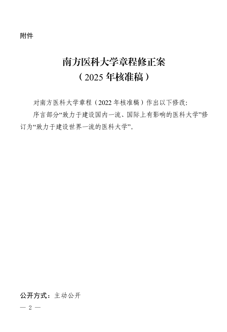 近日,南方醫科大學提出對大學章程作出以下修改:序言部分“致力于建設國內一流、國際上有影響的醫科大學”修訂為“致力于建設世界一流的醫科大學”。
