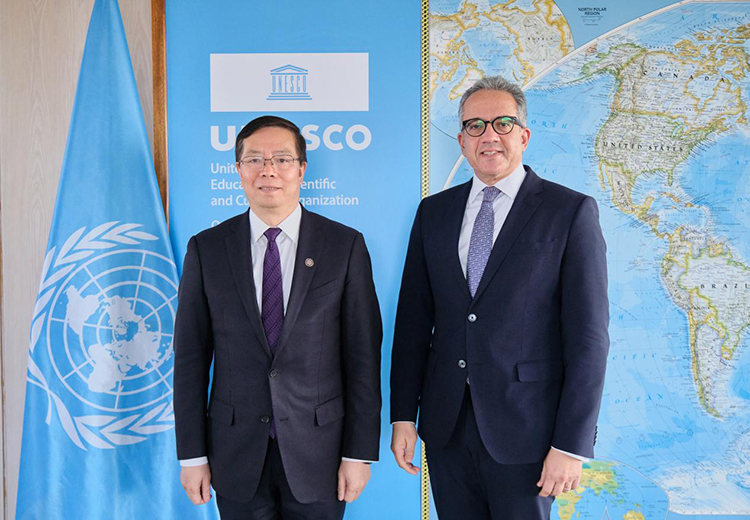 訪問法國期間,15日上午,邱勇與聯合國教科文組織(UNESCO)總干事哈立德·阿納尼(Khaled El-Enany)會面交流。邱勇介紹了清華在國際合作方面的最新進展并表示,愿與聯合國教科文組織在人工智能、在線教育、文化遺產保護、青年能力建設等方面深化合作,助力推動全球可持續發展。阿納尼期待雙方在人工智能教育創新、數字文化遺產保護等領域開展合作,并通過專項訪問學者計劃、聯合研究基金等方式支持包括小島嶼發展中國家在內的發展中國家建設。