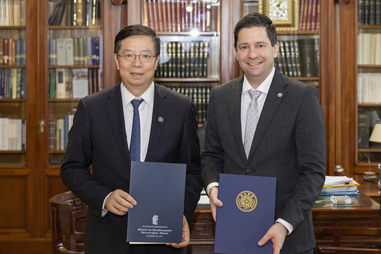 17日上午,邱勇訪問雅典理工大學,與該校校長約安尼斯·哈齊喬治烏(Ioannis K. Chatjigeorgiou)就進一步拓展雙方在人工智能、能源轉型、人文研究及數字文化遺產等領域的合作進行了探討。其間,兩校簽署了學生交換協議。