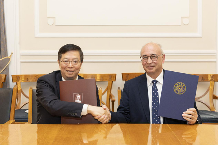 17日下午,邱勇訪問雅典經濟與商業大學,與該校校長瓦西里斯·瓦斯德基斯(Vassilis Vasdekis)圍繞加強人才培養、聯合科研、金融科技等方面的務實合作進行了交流,并簽署了兩校合作備忘錄。
