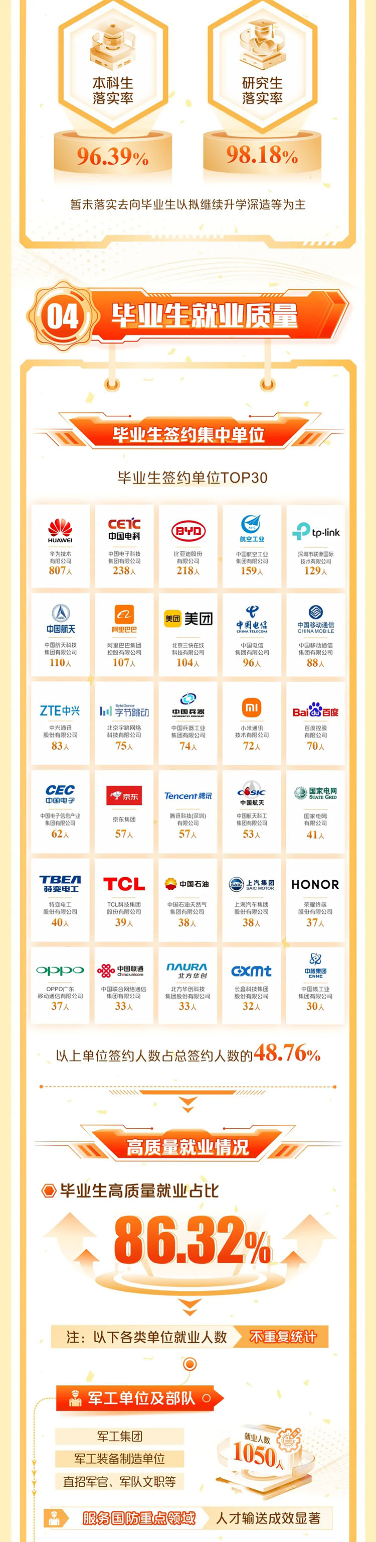 就業頭部企業扎堆:華為(807人)、中國電科(238人)、比亞迪(218人)、中航工業159人、TP-Link129人、中國航天110人、阿里巴巴107人、美團104人……