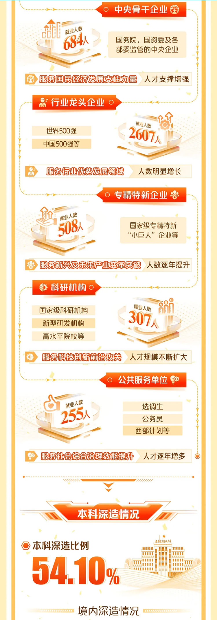 升學深造亮點:本科深造率 54.10%,境內深造的95%進入 “雙一流” 高校/科研院所,頂尖去向包括中國科學院大學、西安交大、東南大學、電子科技大學、中國科學技術大學等;