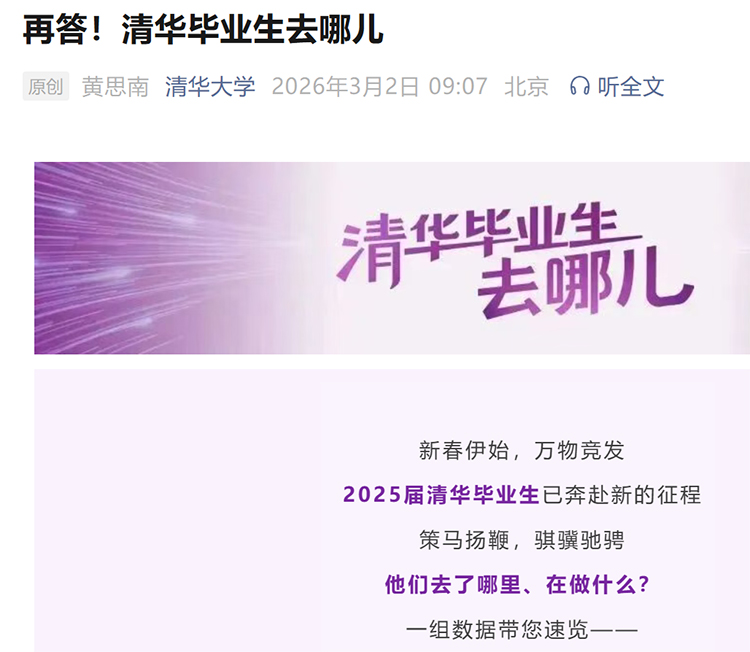 近日,清華大學官微公布2025屆畢業生就業數據。