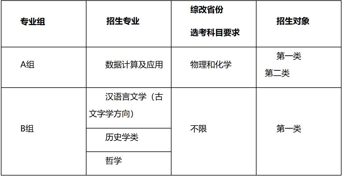 初試考核方式為筆試,專業A組重點考查考生數理科技相關領域知識積累、學習興趣、綜合素質等,專業B組重點考查考生文史哲相關領域知識積累、學習興趣、綜合素質等。考查范圍均不限于高中課程標準范圍。