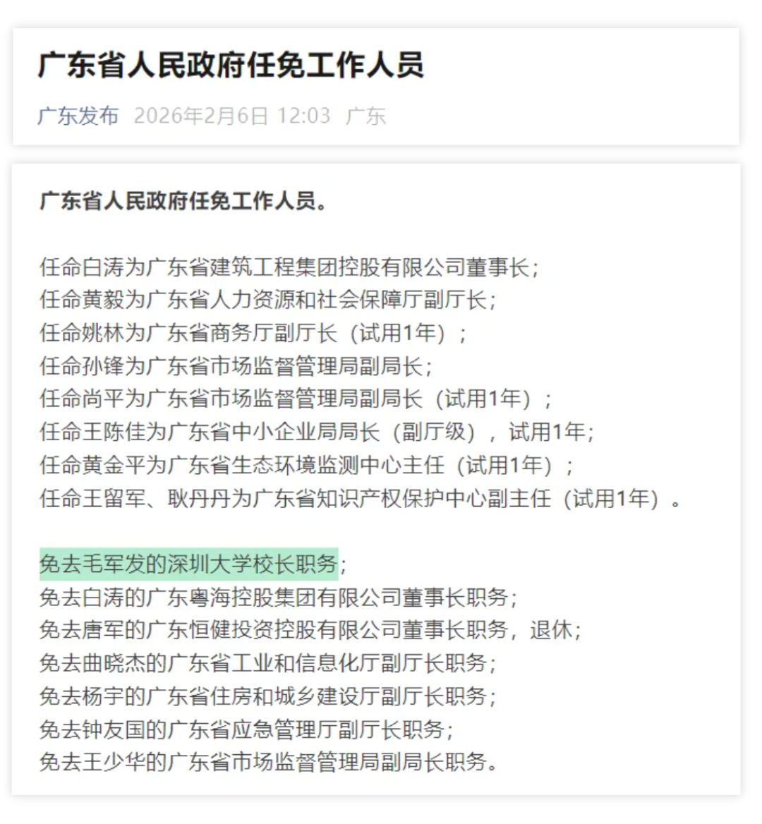 近日,廣東省人民政府任免工作人員,免去毛軍發的深圳大學校長職務。